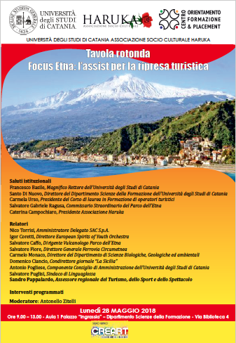 Lunedì 28 maggio appuntamento con l’Associazione Socio Culturale “Haruka” che, in collaborazione con l’Università degli Studi di Catania e il COF&P, organizza una tavola rotonda dal titolo: “Focus Etna: l’assist per la ripresa turistica”.