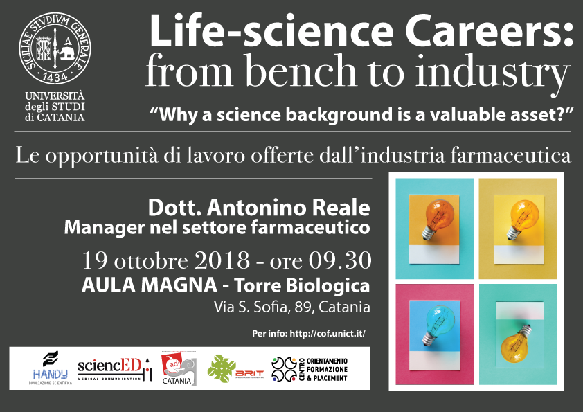 L’evento si inserisce nel ciclo di seminari formativi “Life-science Careers: from bench to industry. Why a science background is a valuable asset?” che si svolgeranno durante l’autunno e che si pongono l’obiettivo di presentare diversi scenari occupazionali rivolti a chi si sta laureando o si è laureato nella discipline del settore life-science.
