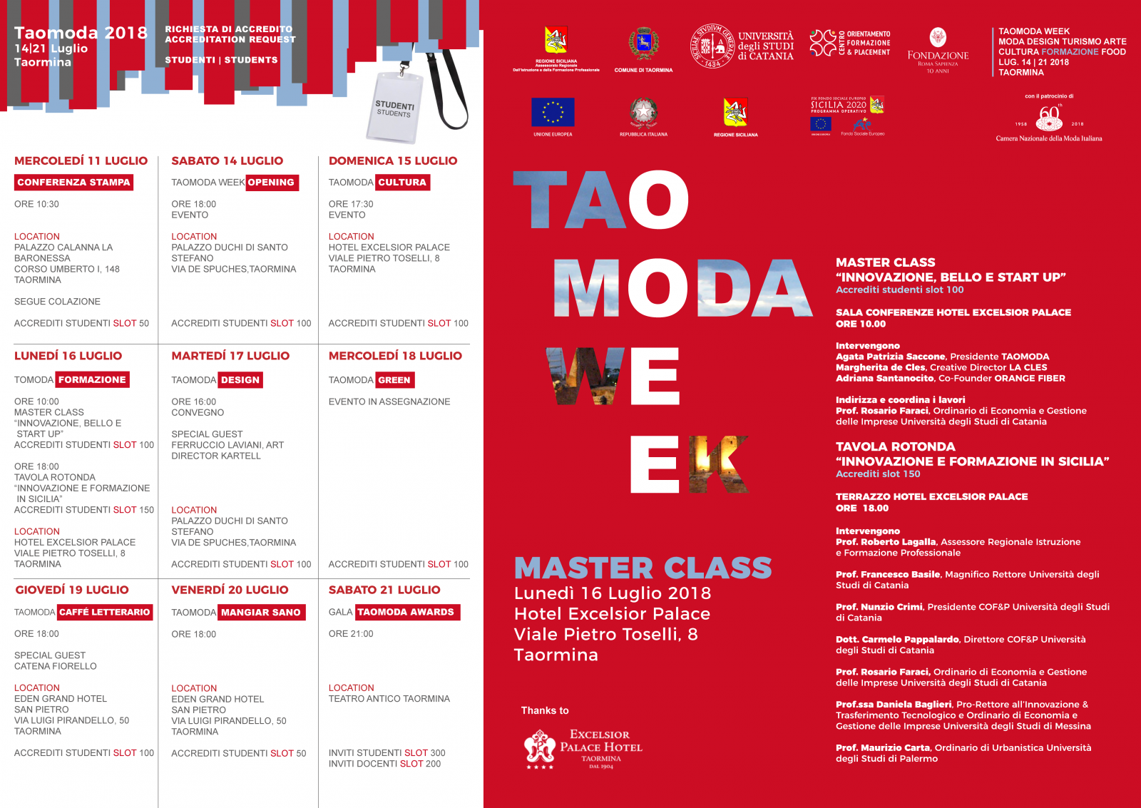 Per ottenere gli accrediti agli eventi gli studenti dovranno presentarsi alla conferenza stampa che si terrà alle 10.30 di giorno 11 luglio presso Palazzo Calanna, Corso Umberto I 148 Taormina. Sarà necessario mostrare un documento di identità e l’autocertificazione di iscrizione all’Ateneo (scaricabile dalla pagina personale del Portale degli Studenti dalle sezione stampe) presso il desk di accoglienza.