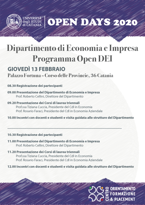 Giovedì 13 febbraio, a partire dalle 9:00, si svolgerà l’open day dedicato alla presentazione dell’offerta didattica e degli sbocchi occupazionali e professionali dei corsi di studio del Dipartimento di Economia e Impresa presso la sede del dipartimento di Palazzo Fortuna in Corso delle Provincie, 36 Catania.