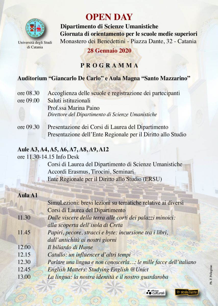 Martedì 28 gennaio, a partire dalle 8:30, al Monastero dei Benedettini (piazza Dante 32, Catania), si svolgerà l’open day dedicato alla presentazione dell’offerta didattica e degli sbocchi occupazionali e professionali dei corsi di studio del Dipartimento di Scienze Umanistiche.