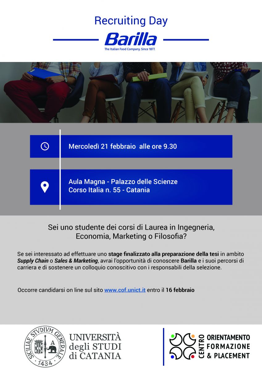 Mercoledì 21 febbraio si svolgerà il Recruting Day dall’ufficio di Placement dell’Università degli Studi di Catania in collaborazione con Barilla, dedicato agli studenti dei corsi di laurea in: