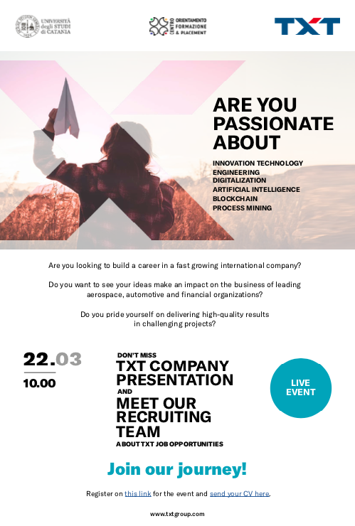 Lunedì 22 Marzo 2021 si svolgerà il Recruiting Day Digitale di TXT a cura di TXT e del Centro Orientamento, Formazione e Placement. L’evento inizierà a partire dalle 10.00.