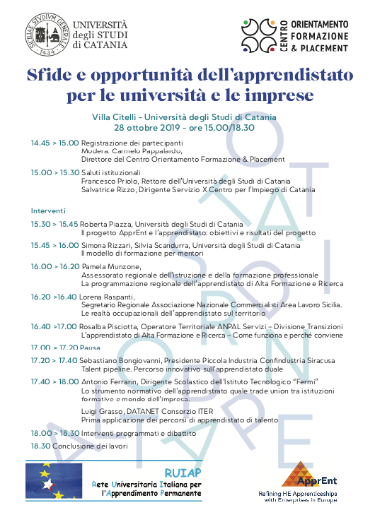 L’evento sarà moderato da Carmelo Pappalardo Direttore del Centro Orientamento Formazione & Placement. Interverranno per i saluti istituzionali Francesco Priolo, Rettore dell’Università degli Studi di Catania, e Salvatrice Rizzo, Responsabile Servizio Centro dell’Impiego di Catania.