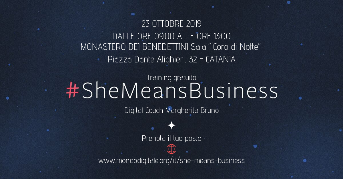 Il 23 ottobre 2019 #SheMeansBusiness fa tappa a Catania. A partire dalle ore 9.00 la coach del programma #SheMeansBusiness, Margherita Bruno, incontra tutte le donne interessate ad approfondire strumenti e strategie social per promuovere la propria attività.