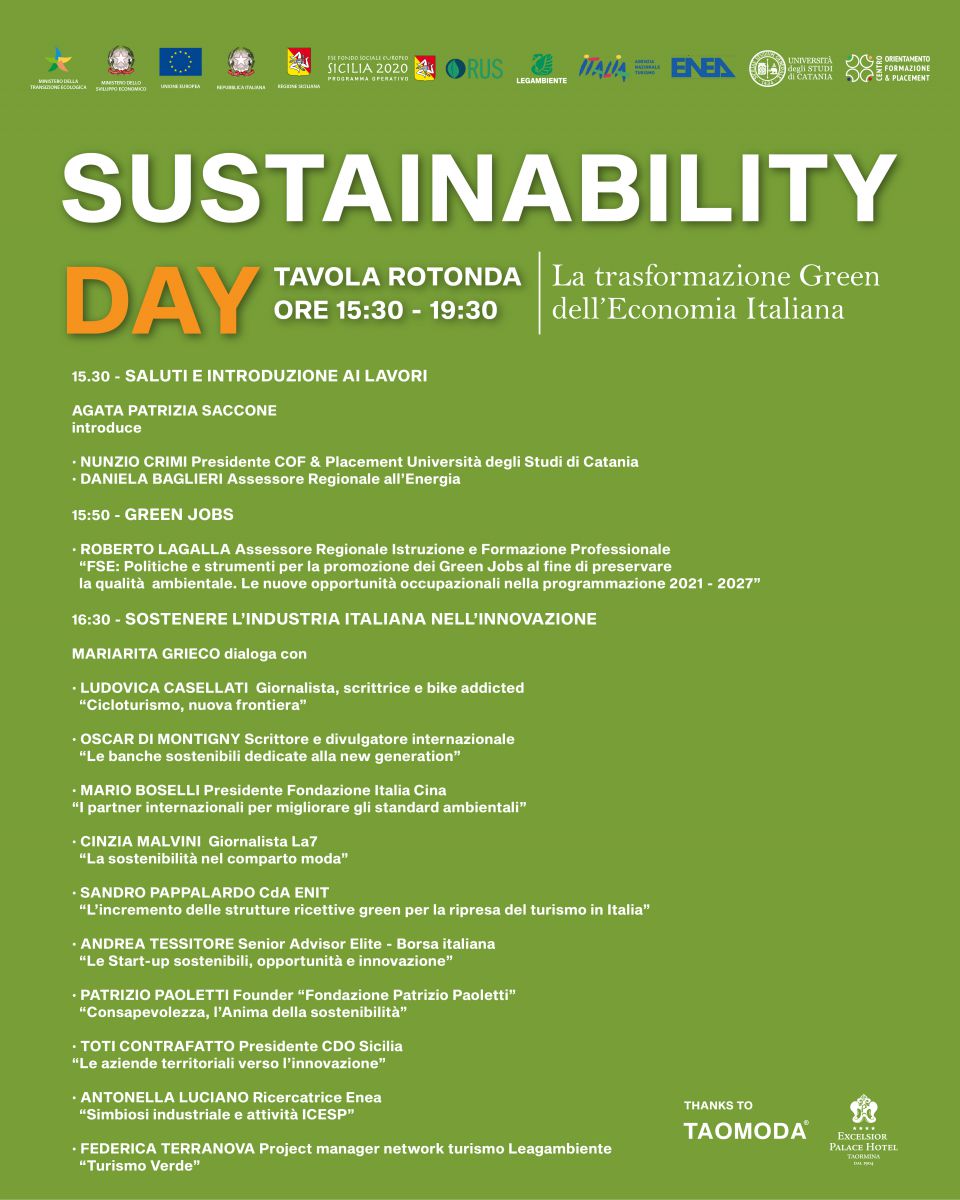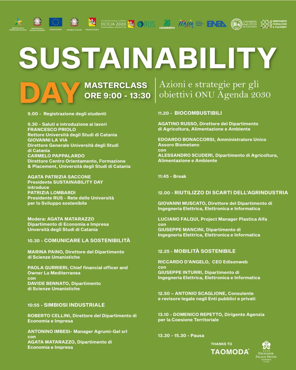 La giornata si aprirà alle ore 9.00 con la Masterclass “Azioni e strategie per gli obiettivi ONU Agenda 2030” cui seguirà alle 15.30 la Tavola rotonda “La trasformazione Green dell’Economia Italiana”.