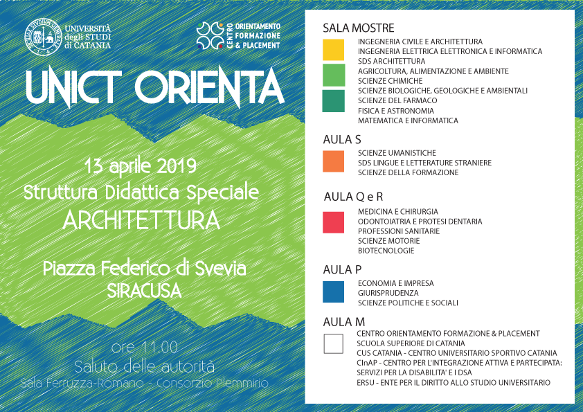Sabato 13 aprile 2019 si svolgerà “UNICT ORIENTA” una giornata di orientamento alla scelta universitaria dedicata alle scuole secondarie superiori. La manifestazione avrà inizio alle ore 9.00 e durerà fino alle 14.00 e si svolgerà presso la Struttura Didattica Speciale di Architettura di Siracusa.