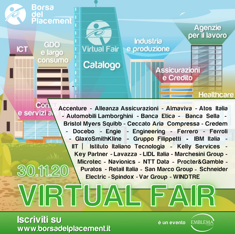 La Virtual Fair è in programma il 30 novembre e vedrà la partecipazione di oltre 40 grandi aziende tra cui: Alleanza Assicurazioni, Automobili Lamborghini, Bristol Myers Squibb, Ferrero, IBM, GlaxoSmithKline, Lavazza, P&G, WindTre, Banca Sella, Spindox, Engie, Banca Etica, Accenture. Per i partecipanti: https://www.borsadelplacement.it/network