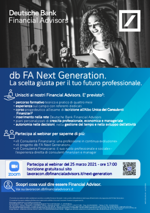 Giovedì 25 marzo alle ore 17:00 sulla piattaforma Zoom si terrà il webinar “db FA Next Generation” in collaborazione con Deutsche Banks.
